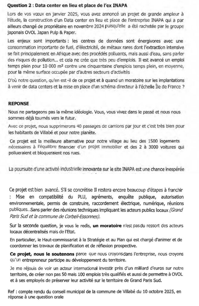 • 10 octobre 2025 : data center sur le site INAPA à Villabé, pour votre information lire ci-dessous la réponse de monsieur Karl Dirat maire de Villabé suite à une question orale lors du conseil municipal de Villabé en date du 10 octobre 2025.